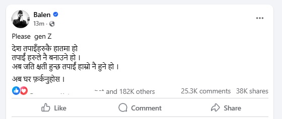 सामाजिक सञ्जाल फेसबुकमार्फत एक आह्वान गर्दै बालेनले भनेका छन्, ‘ प्लिज जेनजी, देश तपाईँहरूकै हातमा हो । तपाईँहरूले नै बनाउने हो । अब जति क्षति हुन्छ तपाईं हाम्रो नै हुने हो । अब घर फर्कनुहोस् ।