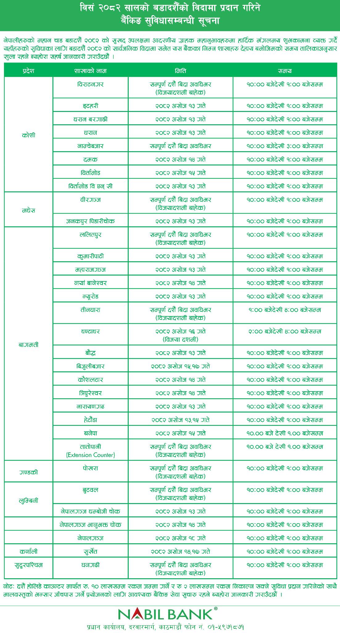 बैंकले सोमबार सूचना जारी गर्दै देशभरका छरिएका शाखा तथा एक्सटेन्सन काउन्टरहरूलाई छुट्टाछुट्टै मिति र समय तोक्दै दशैंको सम्पूर्ण बिदा अवधिभर पनि बैंकिङ सेवा उपलब्ध हुने जानकारी दिएको हो।
