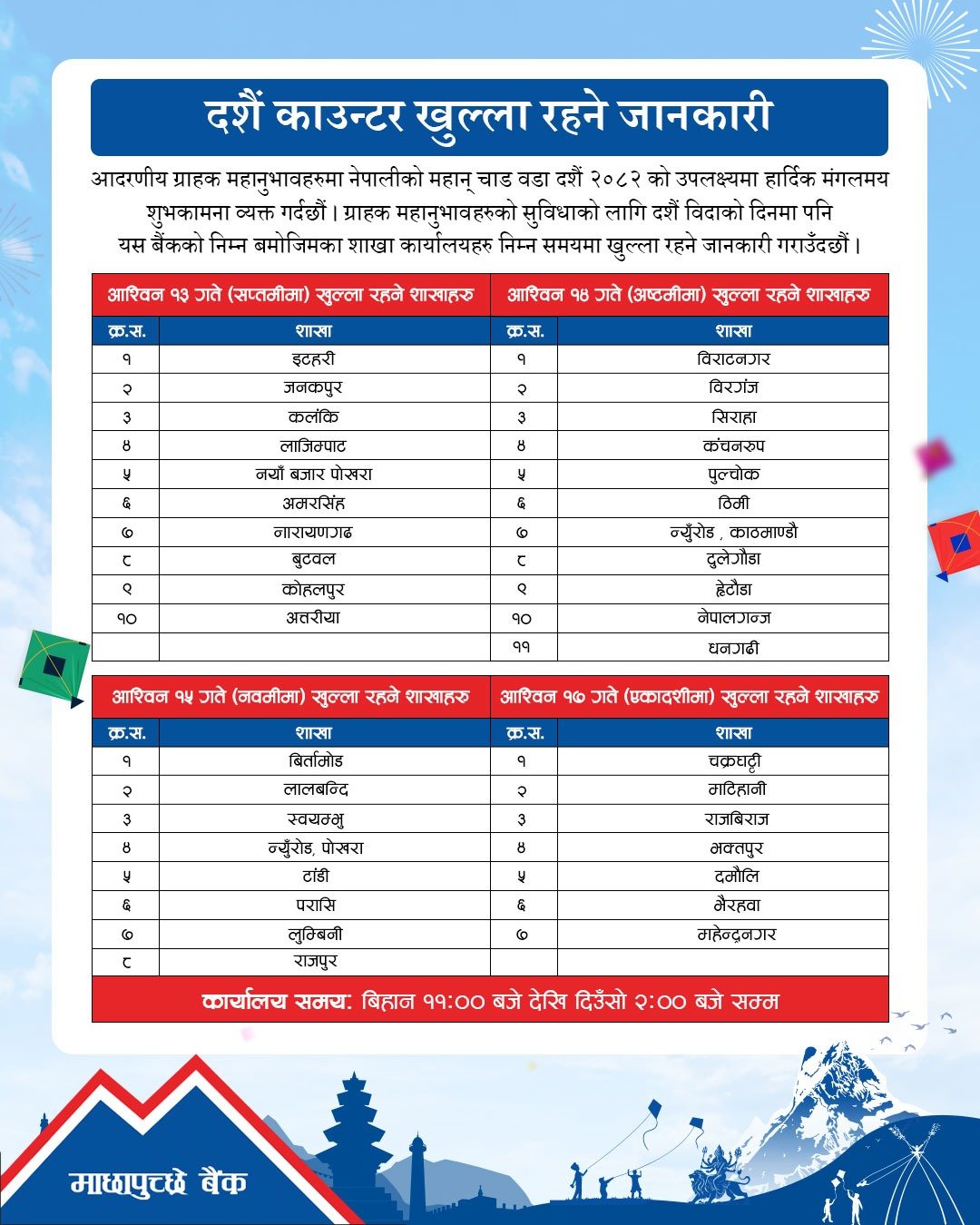 माछापुच्छ्रे बैंकले दशैंको सप्तमी, अष्टमी, नवमी र एकादशीका दिनमा कुल ३३ वटा शाखा कार्यालयहरू खुला राख्नेछ।