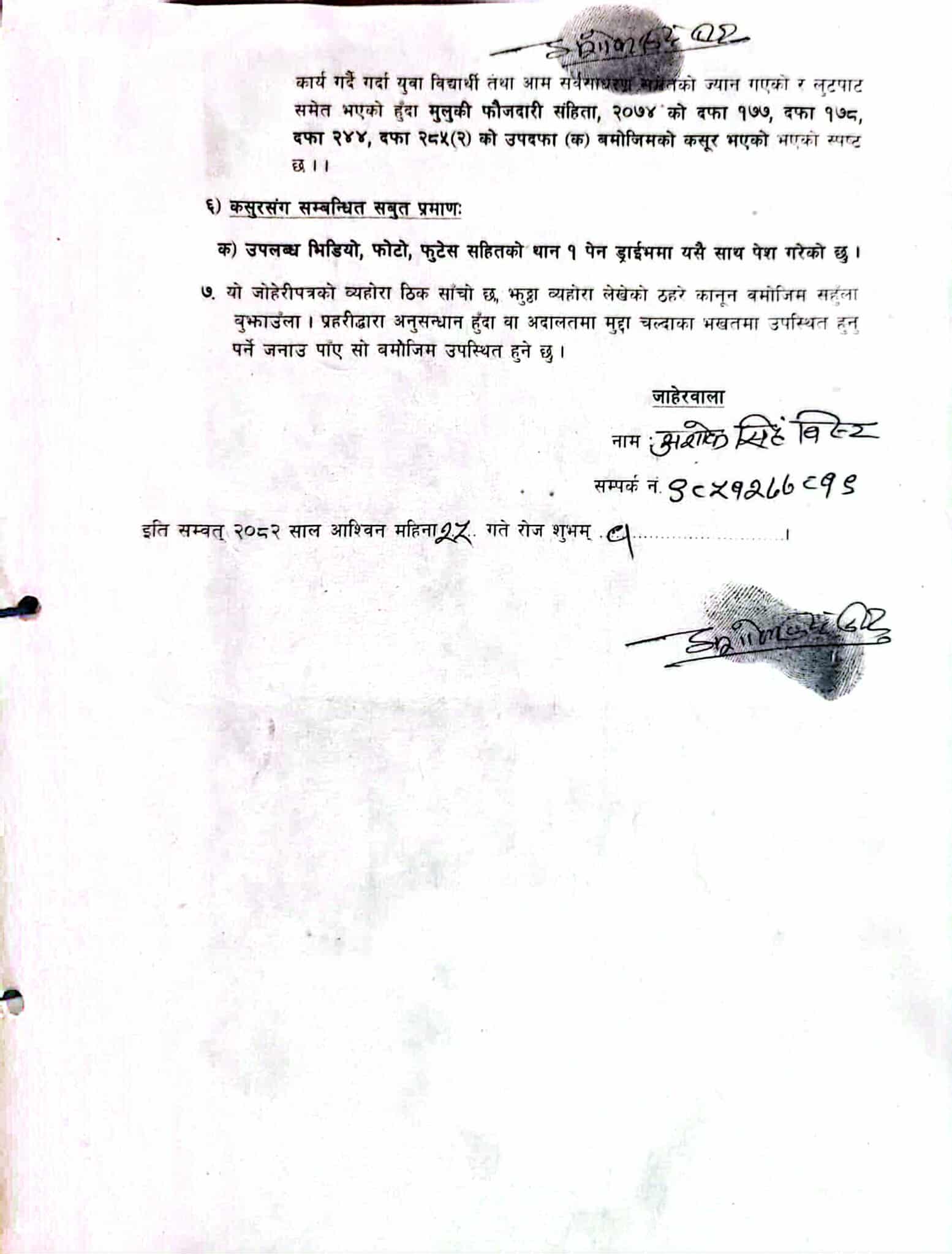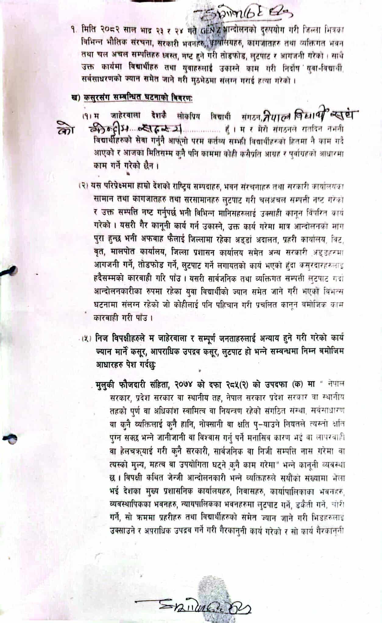 विष्टद्वारा काठमाडौं प्रहरी परिसरमा दर्ता गराइएको जाहेरीमा बालेन र सुधनले युवा विद्यार्थीहरूलाई उक्साएर सर्वसाधारणको ज्यान जाने गरी मुठभेड गराएको, साथै राष्ट्रिय सम्पदा, भवन, सरकारी सामान र कागजात लुटपाट गरी चल–अचल सम्पत्ति नष्ट गर्न उक्साएको आरोप लगाइएको छ।
