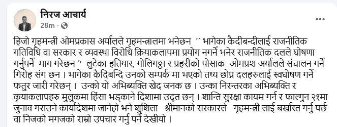सोमबार बिहान सामाजिक सञ्जाल फेसबुकमार्फत आचार्यले भनेका छन्, “हिजो गृहमन्त्री ओमप्रकाश अर्यालले मन्त्रालयमा भागेका कैदीबन्दीलाई राजनीतिक गतिविधि वा सरकार तथा व्यवस्थाविरोधी क्रियाकलापमा प्रयोग नगर्ने घोषणा गर्न दलहरूलाई माग गरेछन्।”