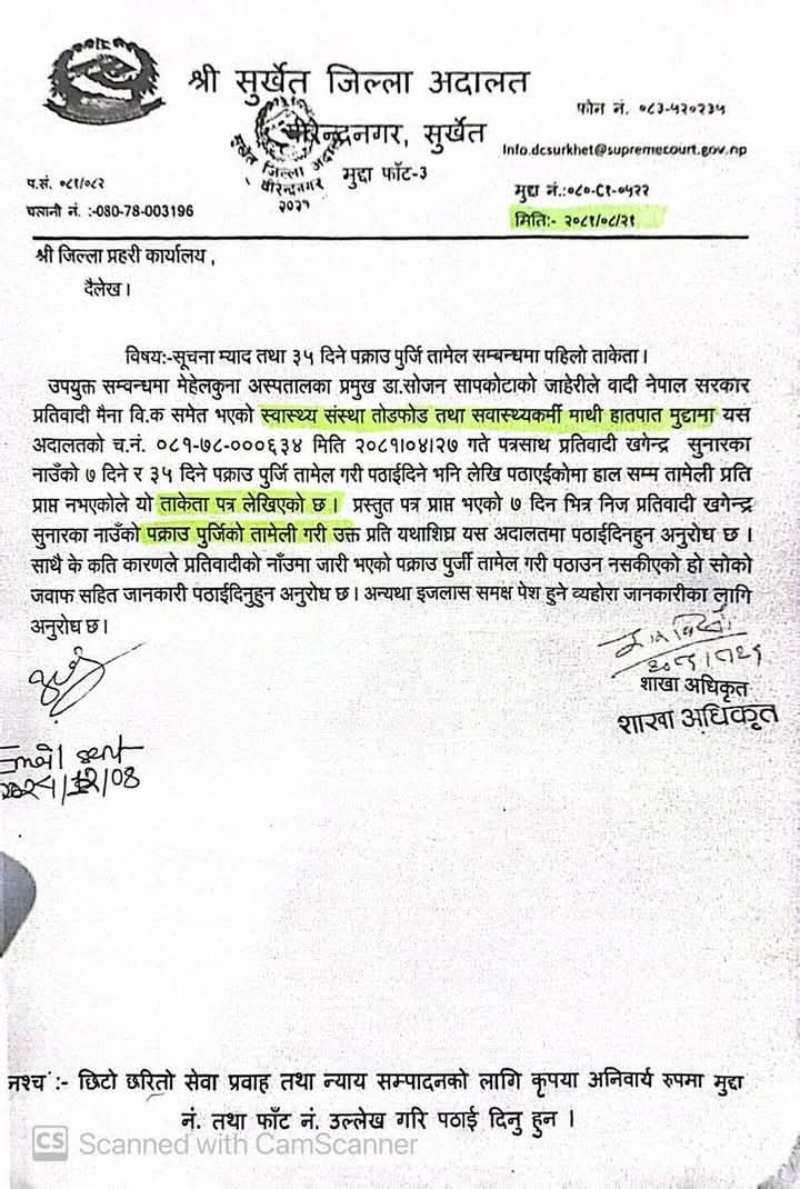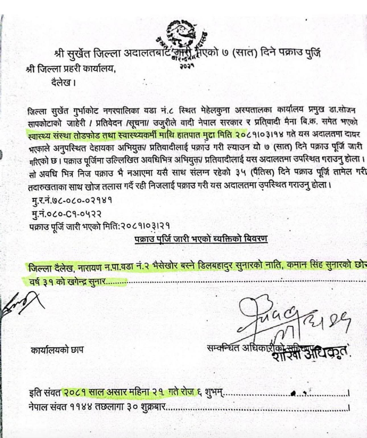 सुनारविरुद्ध सुर्खेतको गुर्भाकोट नगरपालिका–८, मेहेलकुना अस्पतालका प्रमुख डा. सोजन सापकोटाले जाहेरी दिएका थिए। दैलेखका डीएसपी गणेश बरालले सो पत्रबारे अनभिज्ञता जनाउँदै भने, “म अहिले बाहिर छु।”
