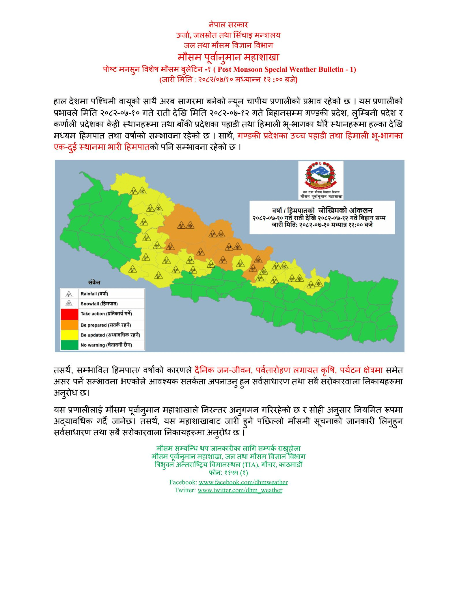 त्यस्तै, गण्डकी, लुम्बिनी, कर्णाली र सुदूरपश्चिम प्रदेशका उच्च पहाडी तथा हिमाली भू–भागमा हल्कादेखि मध्यम हिमपातको सम्भावना रहेको छ। विशेष गरी केही स्थानमा भारी हिमपात हुन सक्ने चेतावनी पनि विभागले दिएको छ।
