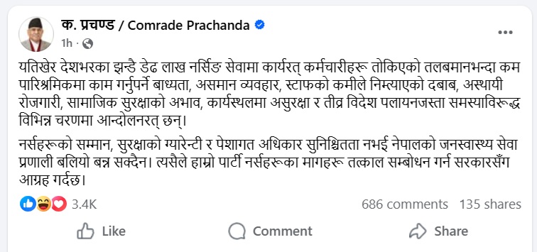 काठमाडौँ । नेकपा (माओवादी केन्द्र) का संयोजक **पुष्पकमल दाहाल ‘प्रचण्ड’**ले देशभर आन्दोलनरत नर्सहरूको माग तत्काल सम्बोधन गर्न सरकारसँग आग्रह गरेका छन् ।