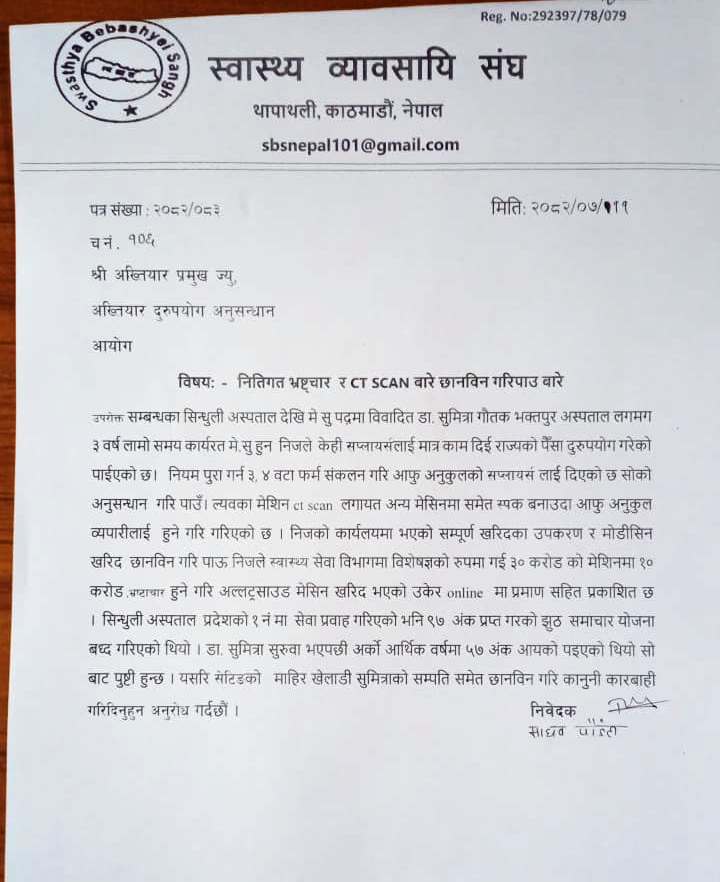 ‘ल्याबका मेसिन, सिटी स्क्यानलगायत अन्य मेसिनमा खरिदमा स्पेक बनाउँदा आफू अनुकुल व्यपारीलाई हुने गरी गरिएको छ । निजको कार्यालयमा भएको सम्पूर्ण खरिदका उपकरण मेडिसिन खरिद छानबिन गरी पाउँ’ उजुरीमा उल्लेख छ ।