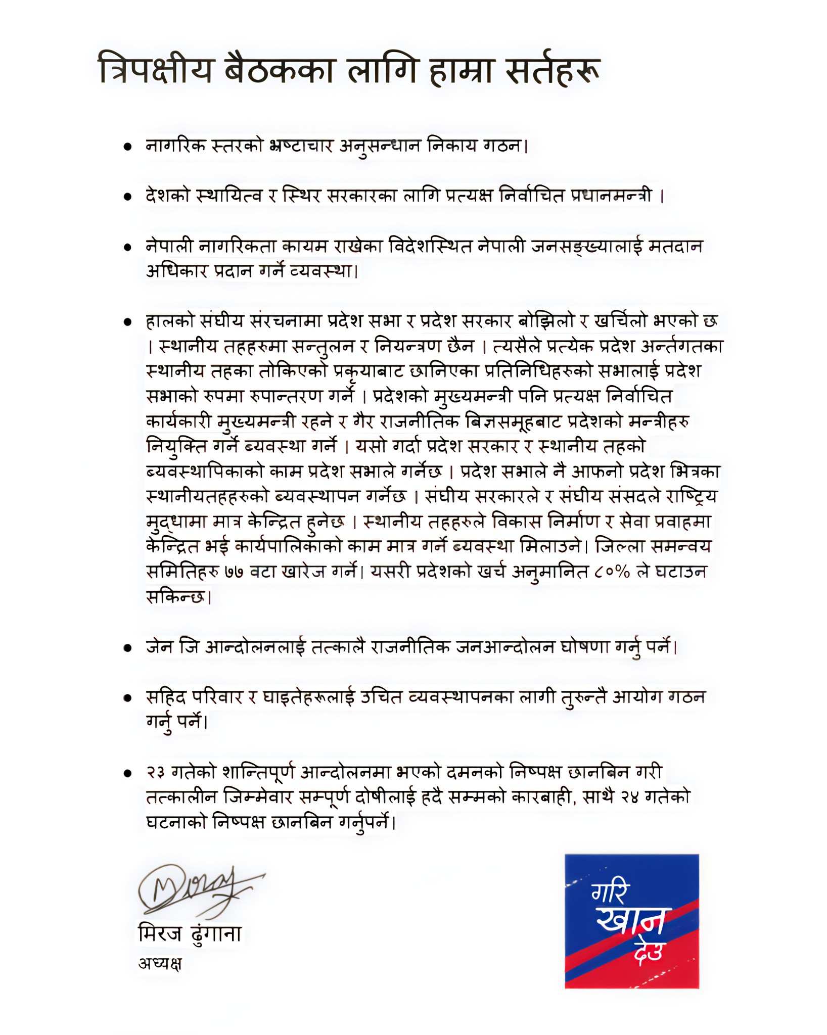 काठमाडौं। नेपाली कांग्रेसका अध्यक्ष गरिखान देउवाका अध्यक्षता तथा जेनजी अगुवा मिरज ढुंगानाले बालुवाटारमा सम्पन्न त्रिपक्षीय बैठकमा सात बुँदे सर्त अघि सारेका छन्।