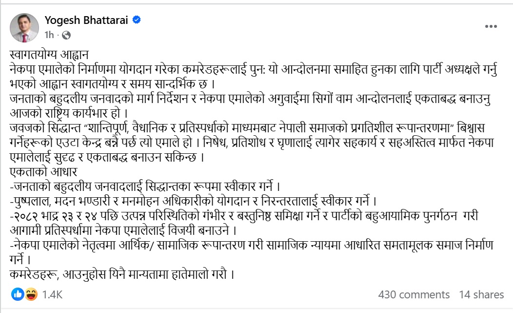 काठमाडौं । नेकपा (एमाले)का सचिव योगेश भट्टराईले पार्टीमा योगदान गरेका तर हाल पार्टी बाहिर रहेका नेताहरूप्रति अध्यक्ष केपी शर्मा ओलीले गरेको आह्वानलाई स्वागतयोग्य र समय सान्दर्भिक बताएका छन्। भट्टराईले सामाजिक सञ्जालमार्फत प्रतिक्रिया दिँदै भनेका छन्,