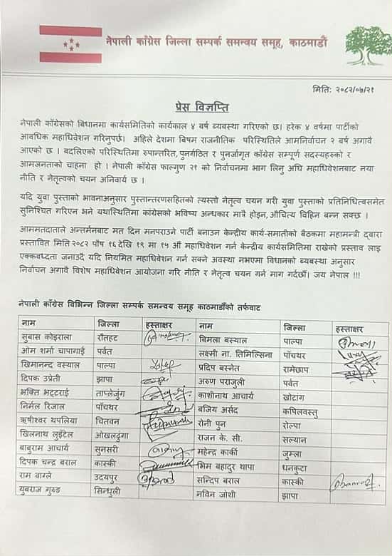 काठमाडौँ । नेपाली काँग्रेसका विभिन्न जिल्लाका काठमाडौँमा उपलब्ध सम्पर्क समितिका सभापतिहरूको बैठकले नेपाली काँग्रेसको १५ औँ महाधिवेशन नियमित रूपमा गर्न माग गरेको छ । आज काठमाडौँको नयाँ बानेश्वरमा बसेको बैठकले जो सभापतिमा निर्वाचित भए पनि काँग्रेसको महाधिवेशन समयमा नै गर्न माग गरेको हो ।