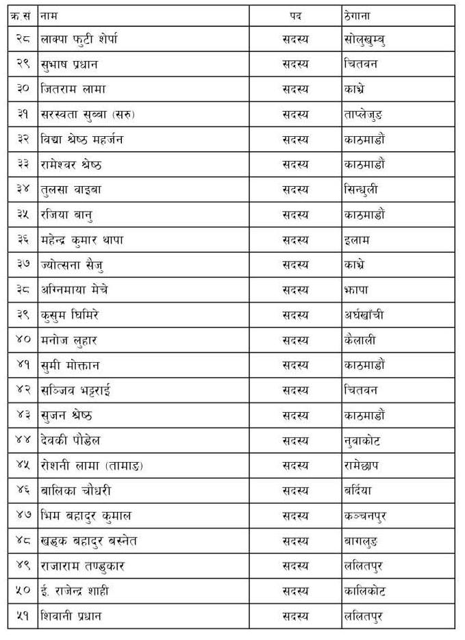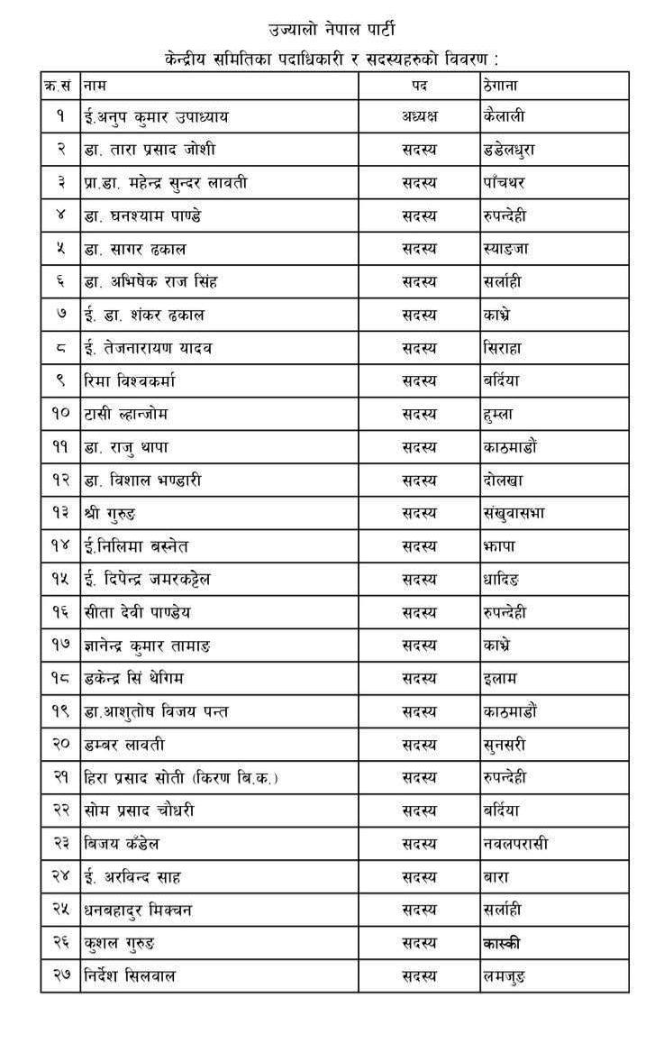 केन्द्रीय कमिटी सूचीमा डा. अभिषेकराज सिंह, रिमा विश्वकर्मा, टासी ल्हान्जोम, डा. विशाल भण्डारी, श्री गुरुङ, निलिमा बस्नेत, ई. दिपेन्द्र जम्मकट्टेल, ज्ञानेन्द्र कुमार तामाङ, डकेन्द्र सिं थेगिम, जितराम लामा, अरविन्द शाह, निर्देश सिलवाल लगायत छन् ।