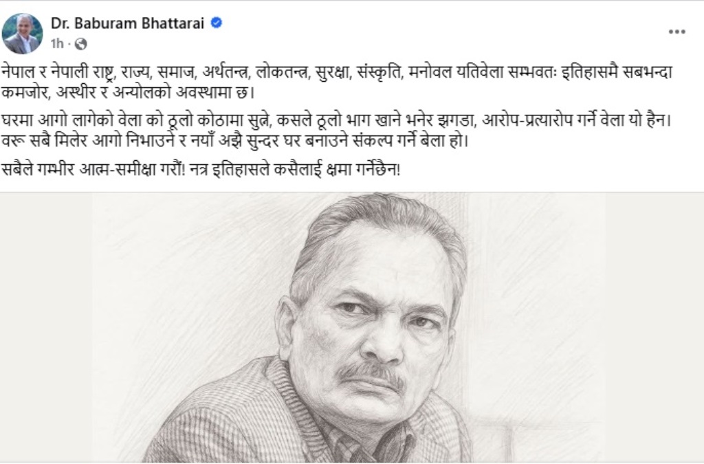 सामाजिक सञ्जालमार्फत उनले भनेका छन्– ‘नेपाल र नेपाली राष्ट्र, राज्य, समाज,अर्थतन्त्र,लोकतन्त्र, संस्कृति, मनोबल यतिवेला सम्भवतः इतिहासमै सबभन्दा कमजोर, अस्थिर र अन्योलको अवस्थामा छ।’