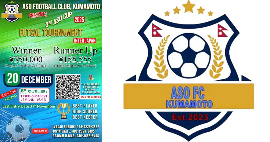 जापान, कुमामोतो । जापानको कुमामोतो क्षेत्रमा सक्रिय रूपमा खेलकुद तथा सामाजिक गतिविधि गर्दै आएको आसो फुटबल क्लब (ASO FC) ले आगामी २०२५ डिसेम्बर २० (शनिबार) का दिन तेस्रो ‘ASO CUP’ फुटसल प्रतियोगिता आयोजना गर्ने भएको छ।