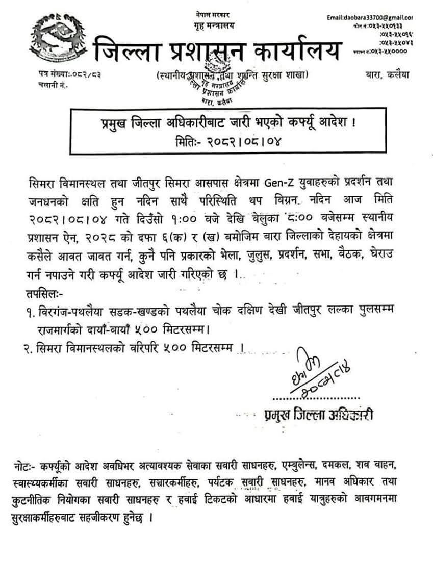 विज्ञप्तिमा भनिएको छ :‘सिमरा विमानस्थल तथा जीतपुर सिमरा आसपास क्षेत्रमा जेनजी युवाहरूको प्रदर्शन तथा जनधनको क्षति हुन नदिन साथै परिस्थिति थप बिग्रन नदिन आज मिति २०८२ मङ्सिर ४ गते दिउँसो १ः०० बजेदेखि बेलुका ८ बजेसम्म स्थानीय प्रशासन ऐन, २०२८ को दफा ६(क) र (ख) बमोजिम सो क्षेत्रमा कर्फ्यु आदेश जारी गरिएको छ ।’