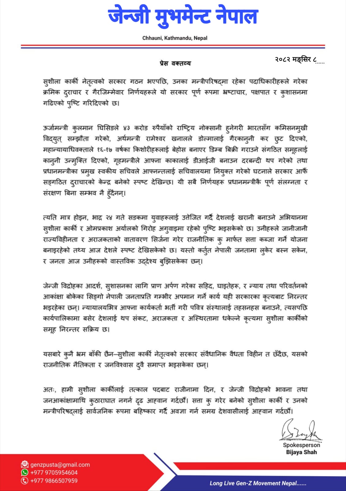 ‘अतः हामी सुशीला कार्कीलाई तत्काल पदबाट राजीनामा दिन र जेनजी विद्रोहको भावना तथा जनआकांक्षामाथि कुठराघात नगर्न आह्वान गर्दछौँ’, जनेजी मुभमेन्टले सोमबार जारी गरेको विज्ञप्तिमा भनिएको छ, ‘सत्ता कु गरेर बनेको सुशीला कार्की र उनको मन्त्रिपरिषदलाई सार्वजनिक रूपमा बहिस्कार गर्दै अवज्ञा गर्न समग्र देशवासीलाई आहन गर्दछौँ ।’
