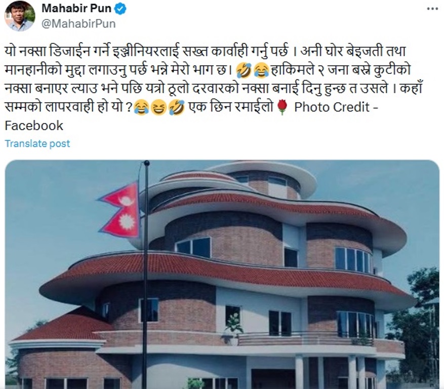 उनले हाकिमले दुई जना बस्ने कुटीको नक्सा बनाउनु भन्दा इन्जिनियरले ‘यत्रो ठूलो दरबारको नक्सा’ बनाइदिएको भन्दै कटाक्ष गरेका छन्। उनले यसलाई ‘कहाँसम्मको लापरवाही’ भन्दै प्रश्न गरेका छन्।