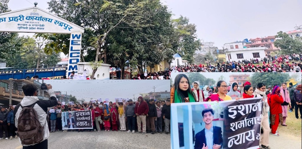 बुटवल । रुपन्देहीको कञ्चन गाउँपालिका–३ धौलागिरी चोकमा १७ वर्षीय किशोर ईशान शर्मा पौडेलको शंकास्पद मृत्युले आक्रोश चुलिँदै गएको छ। घटनामा संलग्नलाई तत्काल पक्राउ गर्न माग गर्दै स्थानीयले ईलाका प्रहरी कार्यालय रुद्रपुर घेराउ गरेका छन्।