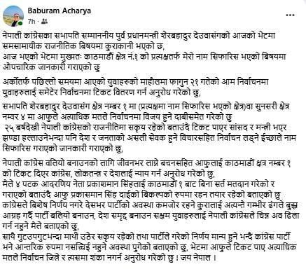 नेपाली काँग्रेस बलियो बनाउनको लागि जीवनभर लाग्ने बचनसहित आफूलाई काठमाडौँ क्षत्र नम्बर १ को टिकट दिएर काँग्रेस, लोकतन्त्र र देशलाई न्याय गर्न सभापति देउवालाई अनुरोध गरेको बताएका छन् ।