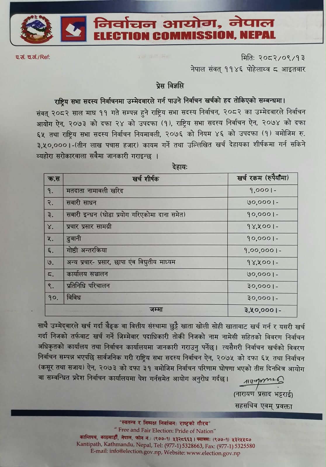 ‘आगामी माघ ११ गते सम्पन्न हुने राष्ट्रिय सभा सदस्य निर्वाचन, २०८२ का उम्मेदवारले निर्वाचन आयोग ऐन, २०७३ को दफा २४ को उपदफा (१), राष्ट्रिय सभा सदस्य निर्वाचन ऐन, २०७५ को दफा ६५ तथा राष्ट्रिय सभा सदस्य निर्वाचन नियमावली, २०७६ को नियम ४६ को उपदफा (१) बमोजिम रु. ३,५०,०००।– (तीन लाख पचास हजार) कायम गर्ने तथा उल्लिखित खर्च देहायका शीर्षकमा गर्न सकिने व्यहोरा सरोकारवाला सबैमा जानकारी गराइन्छ,’आयोगद्वारा जारी प्रेस विज्ञप्तिमा भनिएको छ ।