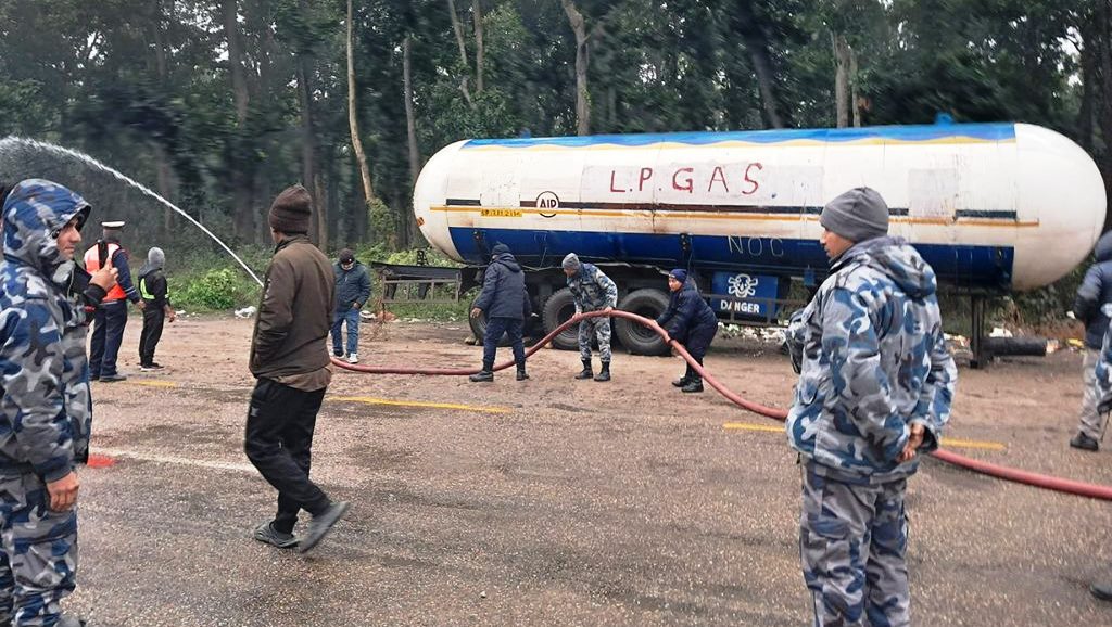 दुर्घटनापछि ग्याँस चुहिएकाले आगलागीको जोखिम भएको भन्दै दमकलले पानी हाल्दै दुईवटा क्रेनले बुलेट उठाइएको थियो । कालोपत्रे राजमार्ग पनि पानीको फोहोरा हानेर सफा गरिएको छ । ग्यास बुलेट भने सडकको किनारमा राखिएको छ ।