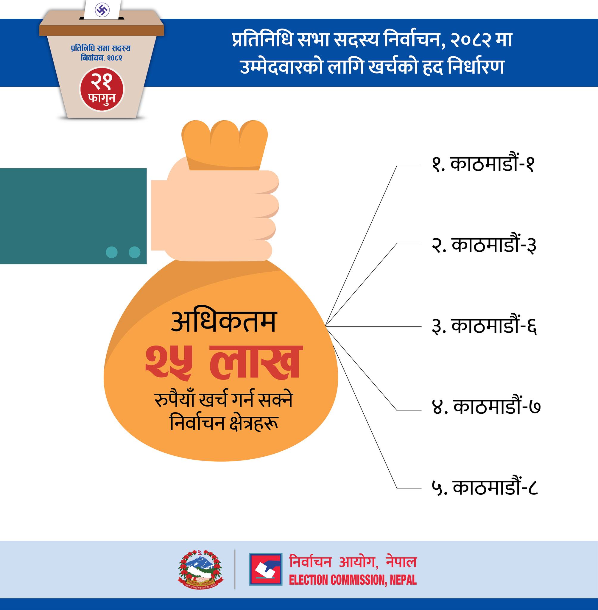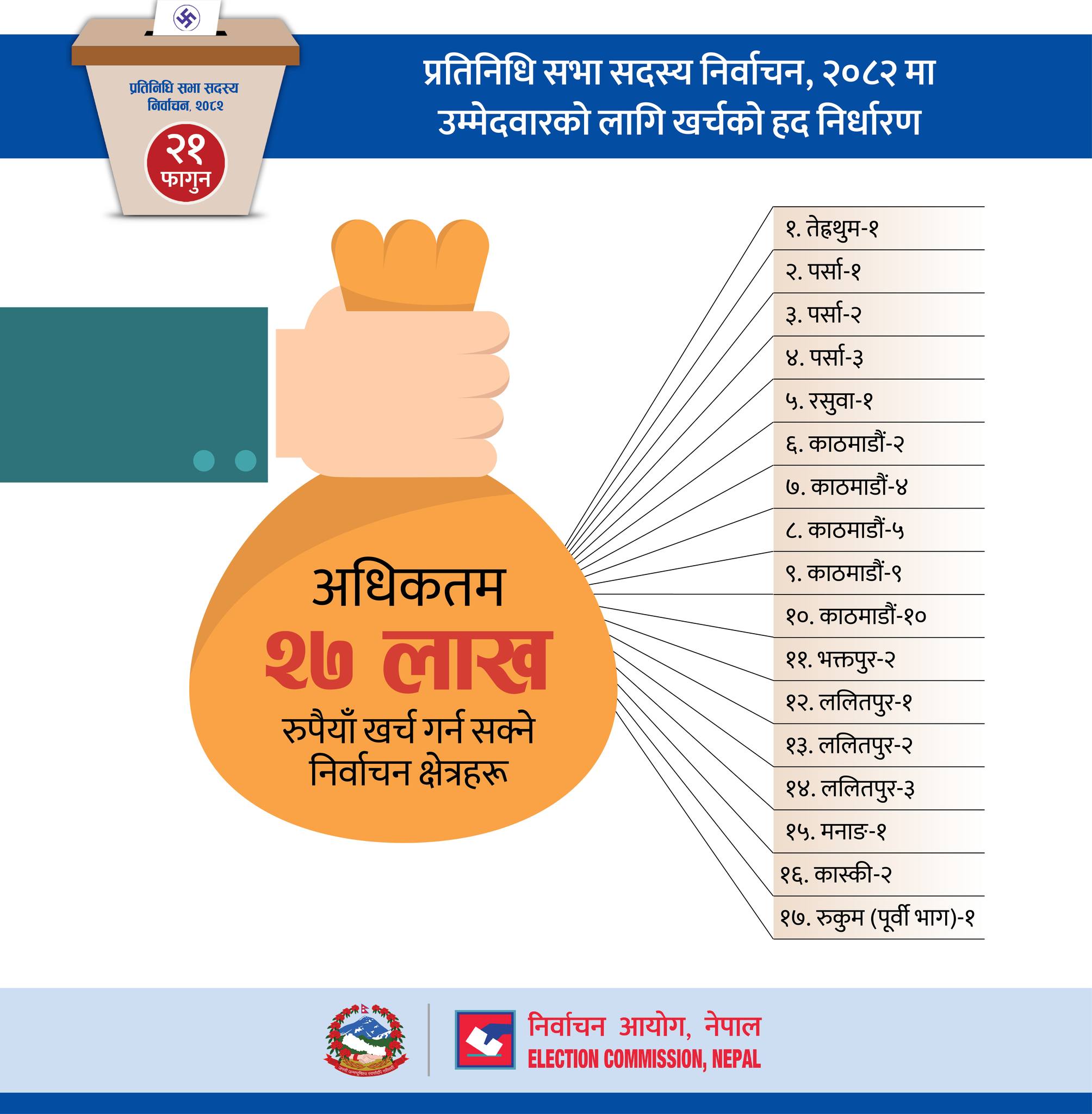 आयोगका अनुसार काठमाडौँका पाँच वटा निर्वाचन क्षेत्रका उम्मेदवारले अधिकतम रु २५ लाख खर्च गर्न पाउनेछन् । त्यसमा काठमाडौँ क्षेत्र नं १, ३, ६, ७ र ८ रहेका छन् । यसैगरी, १७ वटा निर्वाचन क्षेत्रका उम्मेदवारले अधिकतम रु २७ लाख बराबरको खर्च गर्न पाउने सीमा निर्धारण गरिएको छ ।