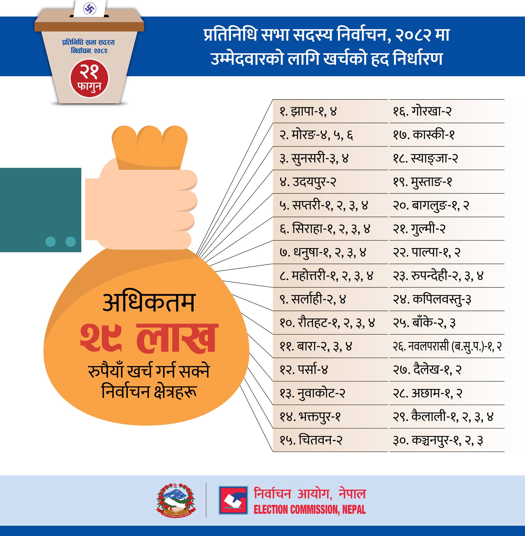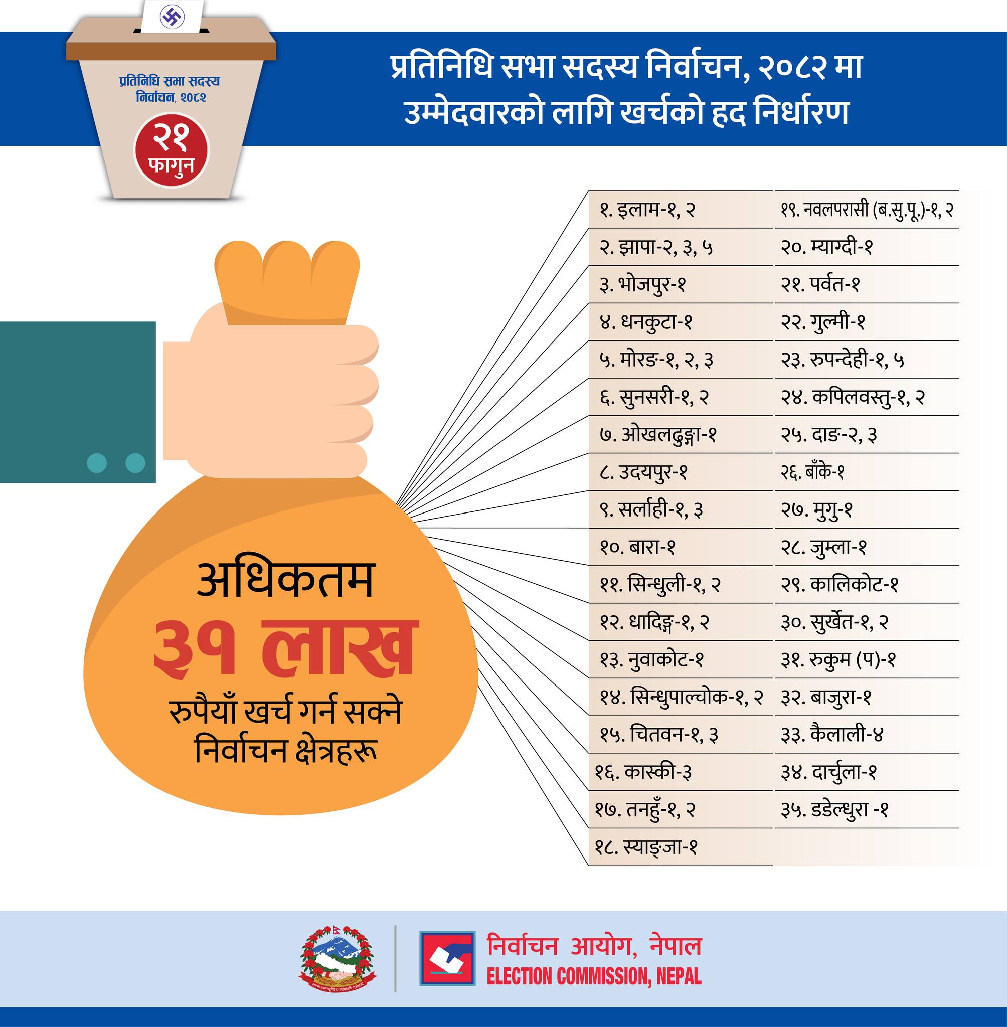त्यस्तै, ६५ वटा निर्वाचन क्षेत्रका उम्मेदवारले अधिकतम रु २९ लाख बराबर खर्च गर्न पाउनेछन् । आयोगका अनुसार ५२ वटा निर्वाचन क्षेत्रका उम्मेदवारले अधिकतम रु ३१ लाख, २६ वटा निर्वाचन क्षेत्रका उम्मेदवारले अधिकतम रु ३३ लाख बराबरको खर्च गर्न पाउने गरी सीमा निर्धारण गरिएको छ ।