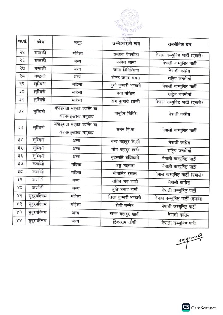 पुस २७ गते उम्मेदवारले नाम फिर्ता लिने तथा उम्मेदवारको अन्तिम नामावली प्रकाशन गर्ने तथा पुस २८ गते उम्मेदवारलाई निर्वाचन चिन्ह प्रदान हुनेछ । आयोगका अनुसार बुधबार १८ पदमा ४४ जनाले दिए उम्मेदवारी दिएका छन् ।