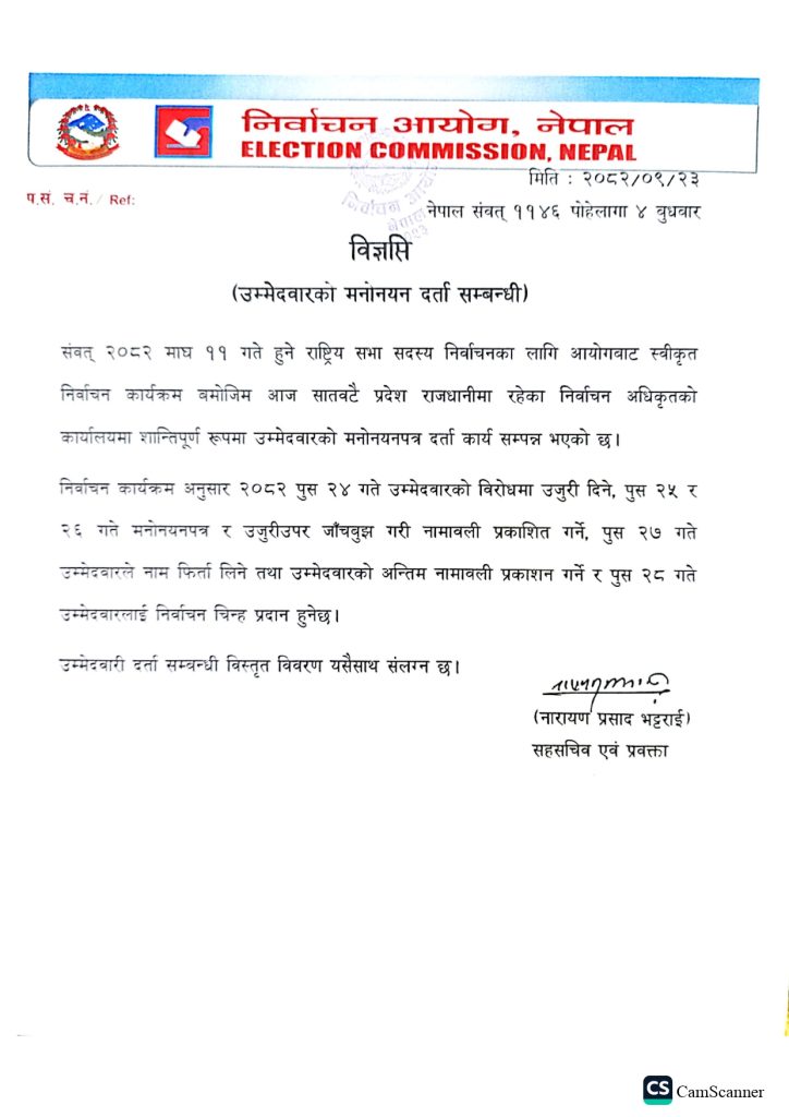 निर्वाचन कार्यक्रमअनुसार भोलि उम्मेदवारको विरोधमा उजुरी दिने, पुस २५ र २६ गते मनोनयनपत्र र उजुरीउपर जाँचबुझ गरी नामावली प्रकाशित गर्ने तालिका छ ।