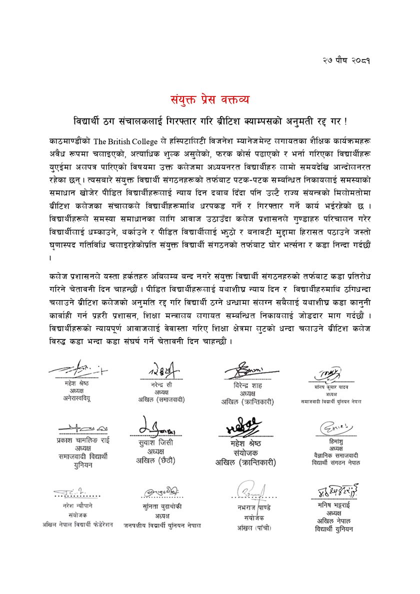 विद्यार्थी संगठनहरूले ब्रिटिश कलेजको अनुमति तत्काल रद्द गरी ठगीधन्दामा संलग्न सञ्चालकलाई कानुनी कारबाही गर्न माग गरेका छन्। कलेज प्रशासनले यस्ता गतिविधि तत्काल बन्द नगरे कडा प्रतिरोधमा उत्रिने चेतावनीसमेत दिएका छन्।