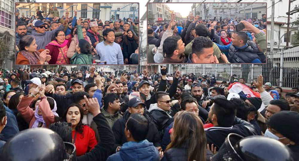 देउवा नेतृत्वको कांग्रेसको तर्फबाट तरुण दल अध्यक्ष विद्वान गुरुङसहित युवाहरू निर्वाचन कार्यालयअगाडि धर्ना दिँदै नाराबाजी गरिरहेका छन् ।