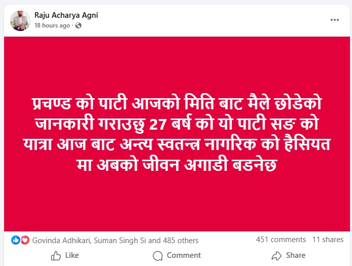 आचार्यले सामाजिक सञ्जाल फेसबुकमार्फत स्टाटस लेख्दै आफूले पार्टी छोडेको सार्वजनिक जानकारी दिएका हुन्। उनले लेखेका छन्, “प्रचण्ड नेतृत्वको पार्टी आजको मितिदेखि मैले छोडेको जानकारी गराउँछु। २७ वर्ष लामो यो राजनीतिक यात्रालाई आज अन्त्य गर्दै स्वतन्त्र नागरिकको हैसियतमा अबको जीवन अगाडि बढ्नेछु।”