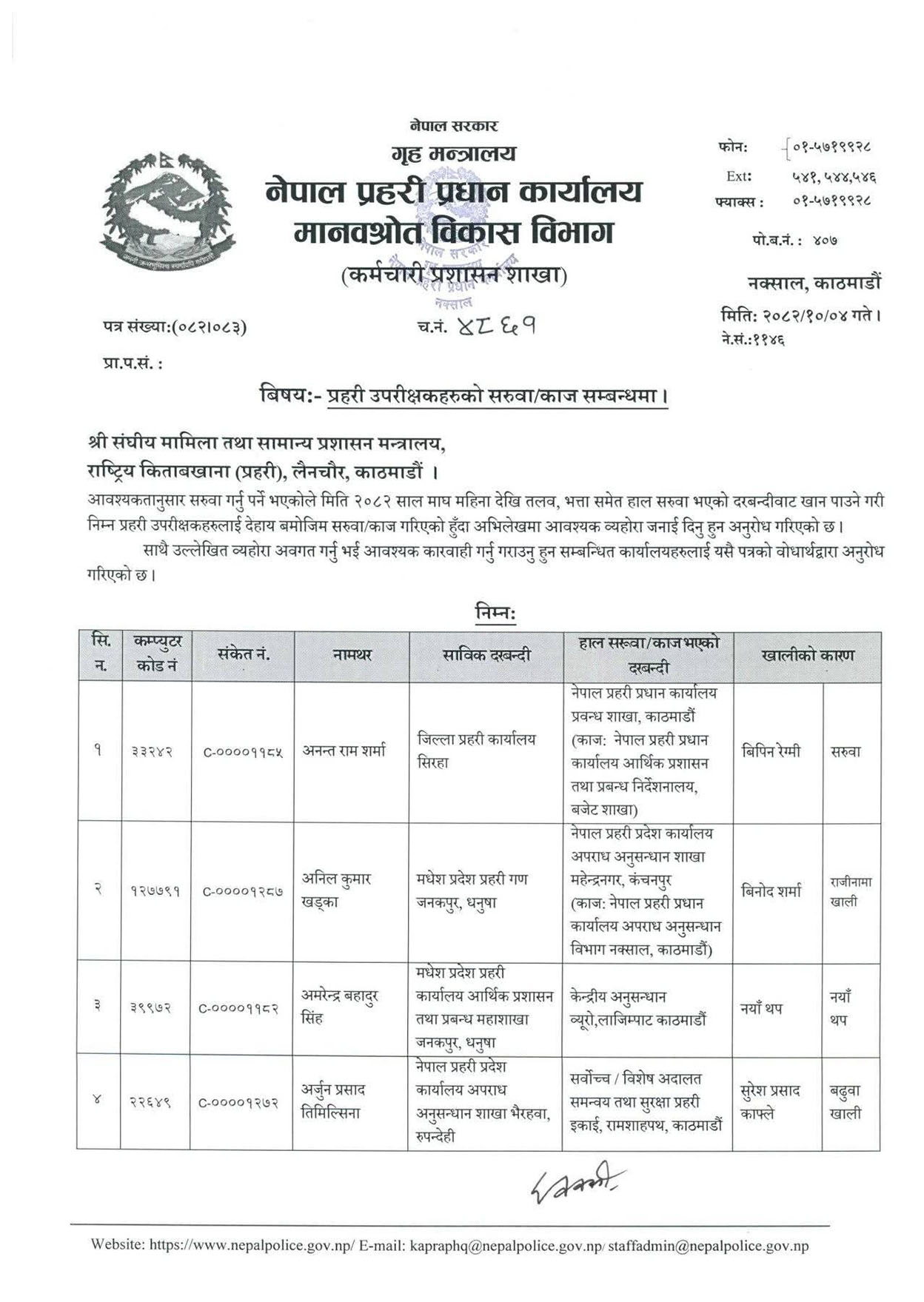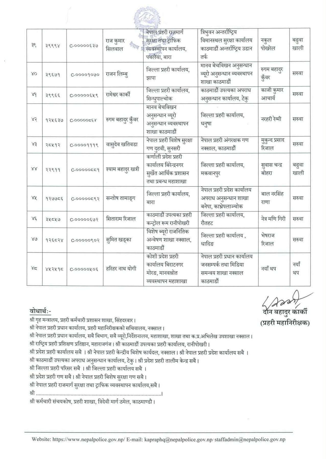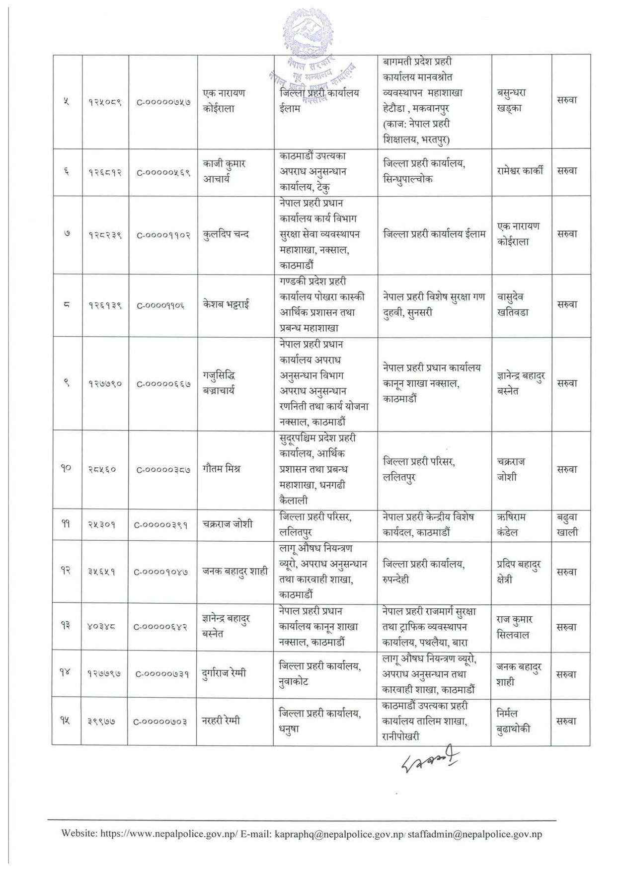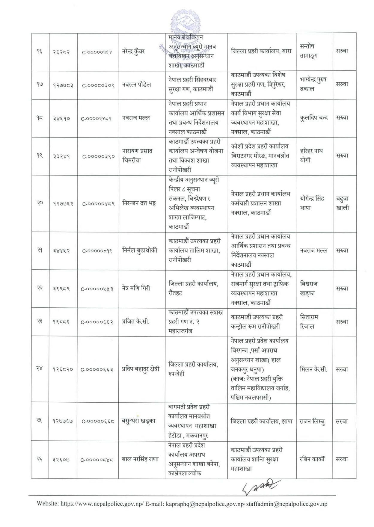 एसपीहरु अनन्तराम शर्मा, अनिल कुमार खड्का, अमरेन्द्रबहादुर सिंह, अर्जुन प्रसाद तिमिल्सिना, एक नारायण कोइराला, काजी कुमार आचार्य, कुलदीप चन्द, केशव भट्टराई, गजुसिद्धी बज्राचार्य, गौतम मिश्र लगायतको सरुवा भएको छ ।