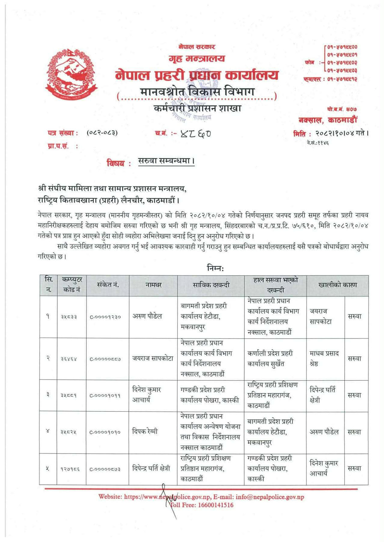 पौडेललाई प्रहरी प्रधान कार्यालयको कार्यविभाग कार्य निर्देशनालयमा, सापकोटालाई कर्णाली प्रदेशमा, आचार्यलाई प्रहरी प्रशिक्षण प्रतिष्ठान महाराजगञ्जमा र रेग्मीलाई अन्वेषण योजना तथा विकास निर्देशनालयमा सरुवा गरिएको छ ।