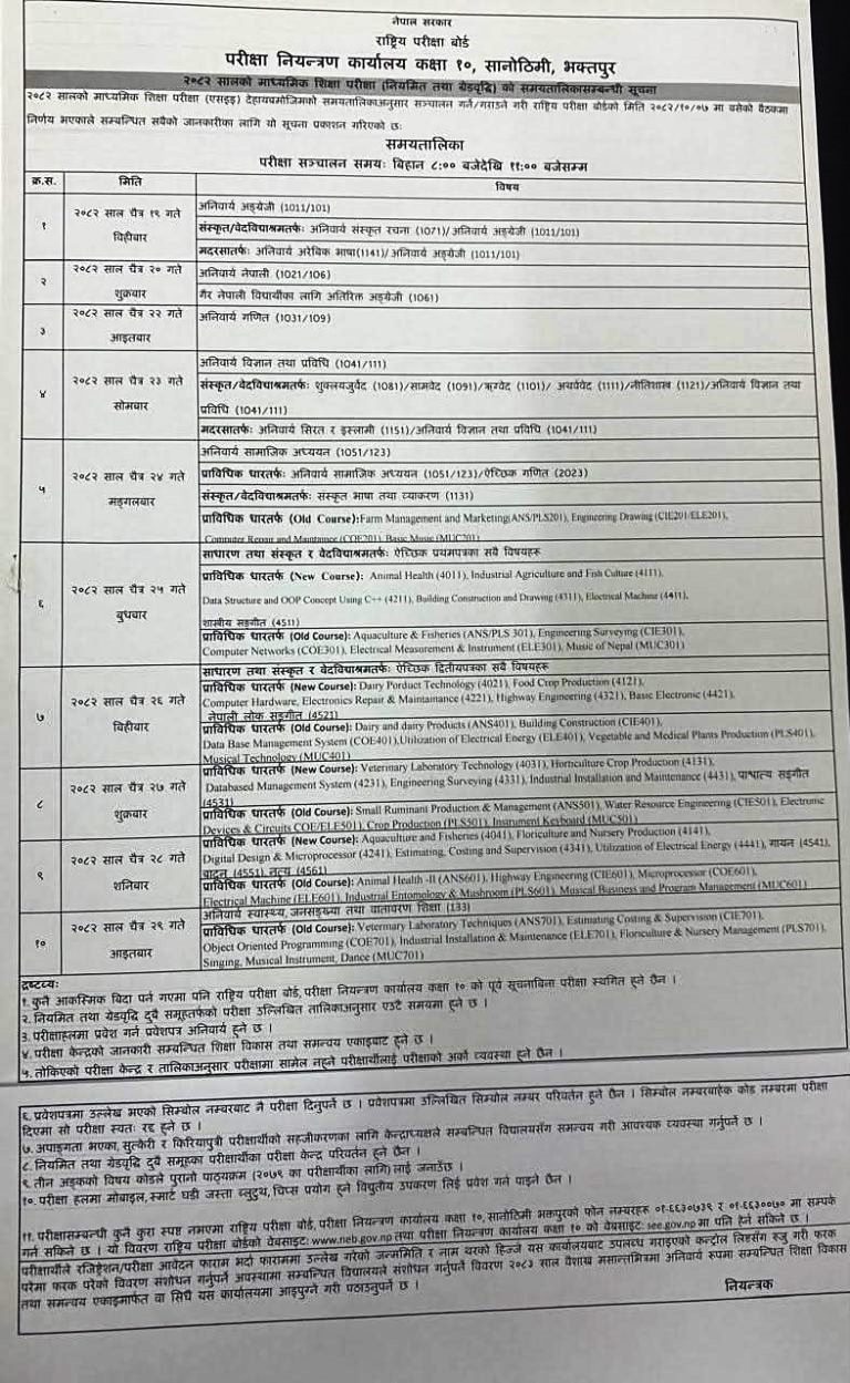 त्यस्तै दोस्रो दिन अनिवार्य नेपाली र गैरआवसीय नेपाली विद्यार्थीको लागि अतिरिक्त अंग्रेजीको परीक्षा हुनेछ । कुन दिन कुन परीक्षा हेर्नुहोस् तालिका