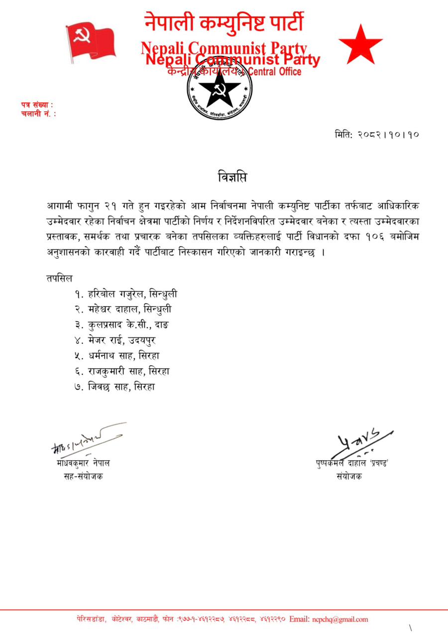 पार्टीको आधिकारिक उम्मेवार विरूद्ध बागी उम्मेदवार खडा गरी त्यसको प्रस्तावक र समर्थक बनेको भन्दै गजुरेलसहित ७ जनालाई नेकपाले निष्कासन गरेको हो।