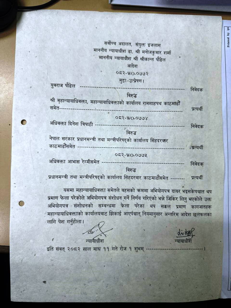 उक्त रिट सुनुवाइका लागि आइबार न्यायाधीशद्वय मनोजकुमार शर्मा र श्रीकान्त पौडेलको इजलासमा तोकिएको थियो ।