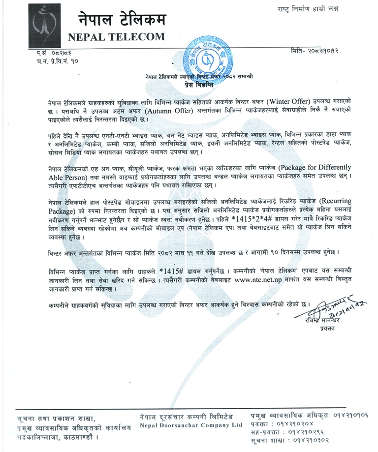 नेपाल टेलिकमले ल्यायो आकर्षक विन्टर अफर, यस्ता छन् सुबिधा