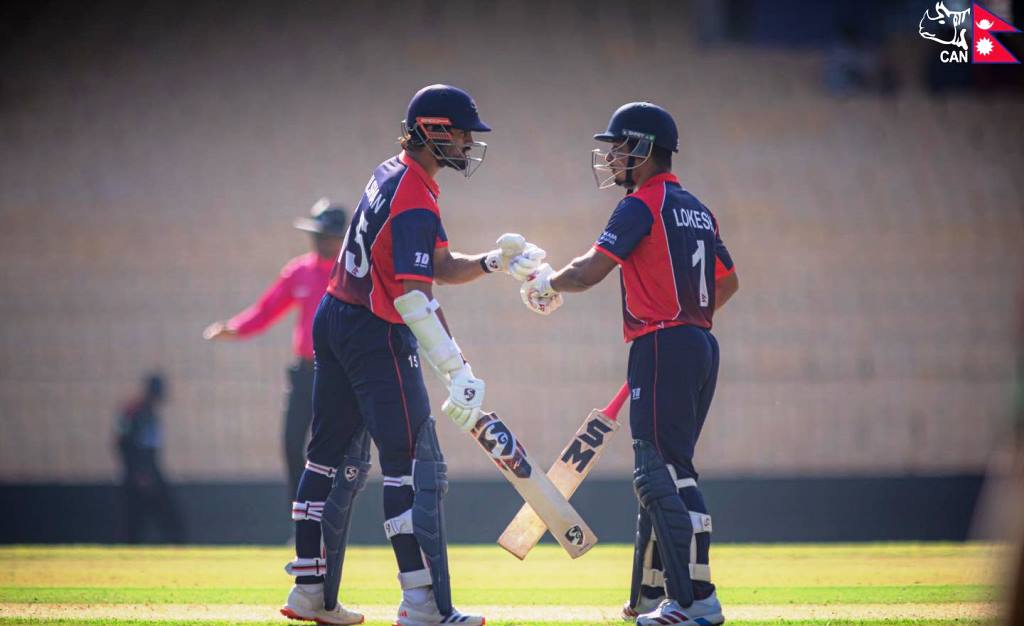 १८५ रनको लक्ष्य पछ्याउने क्रममा कुशल भुर्तेल र आसिफ शेखले नेपाललाई राम्रो सुरुवात दिलाएका थिए । तर चौथो ओभरमा आसिफ शेख आउट भएपछि नेपालले लगत्तै छैटौं ओभरमा कुशल भुर्तेललाई पनि गुमायो । भुर्तेलले १७ बल खेल्दै ४ चौका र १ छक्का मदतमा २९ रन जोडे ।