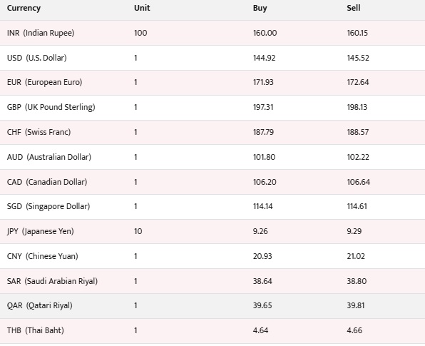 यस्तै, युरोपियन युरो एकको खरिददर १७१ रुपैयाँ ९३ पैसा र बिक्रीदर १७२ रुपैयाँ ६४ पैसा, युके पाउन्ड स्टर्लिङ एकको खरिददर १९७ रुपैयाँ ३१ पैसा र बिक्रीदर १९८ रुपैयाँ १३ पैसा कायम गरिएको छ ।