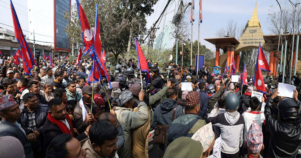त्रिभुवन विमानस्थल गेटबाहिर प्रदर्शनमा उत्रिए ज्ञानेन्द्र शाहको स्वागतका लागि पुगेका राजावादी