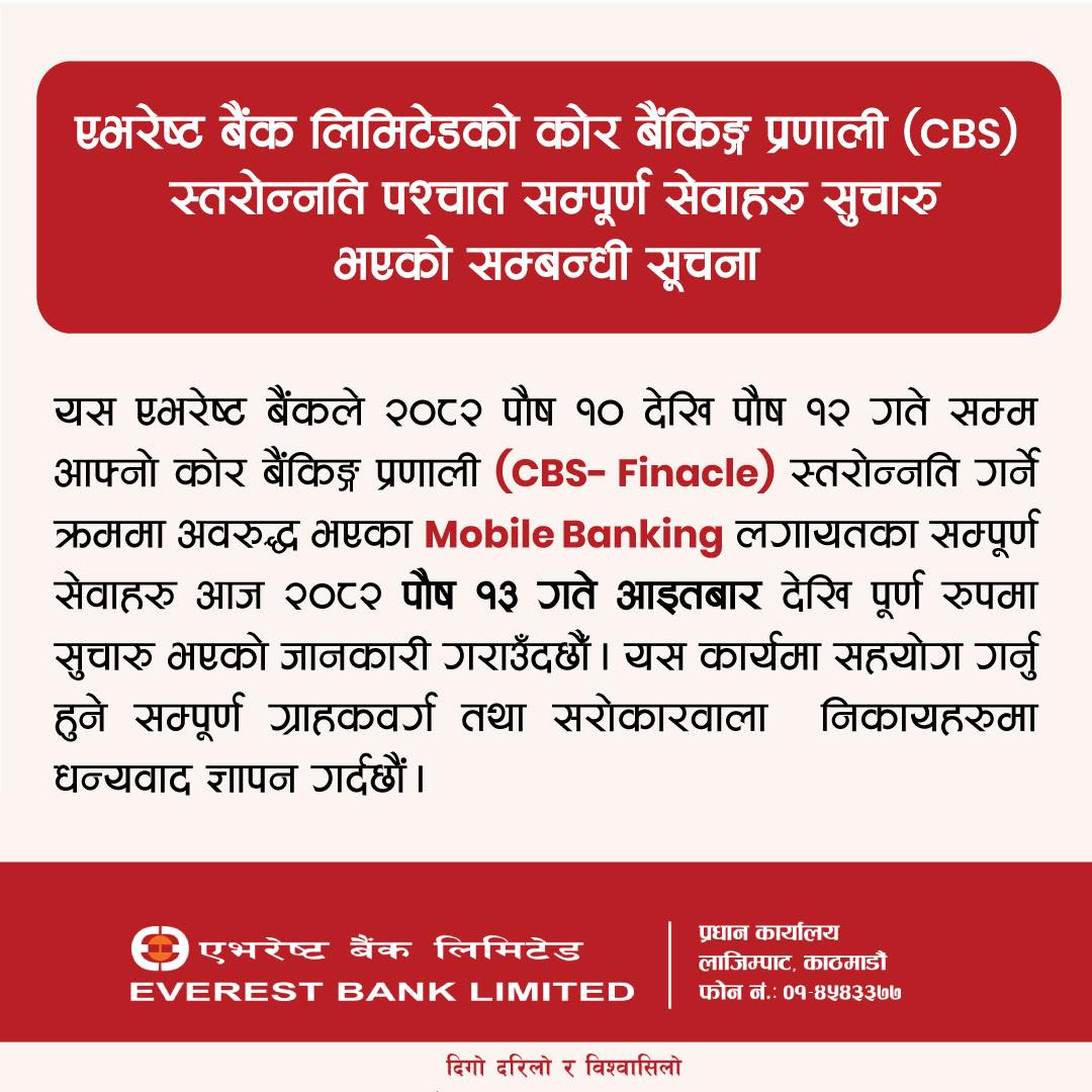 अब उक्त कोर बैंक प्रणाली स्तरोन्नतिको काम पूरा भईसकेकाले २०८२ पौष १३ गते आइतबारदेखि सबै बैंकिङ सेवा पूर्णरुपमा सुचारु भईसकेको जानकारी एभरेस्ट बैंकले दिएको छ। हेर्नुहोस् सूचना