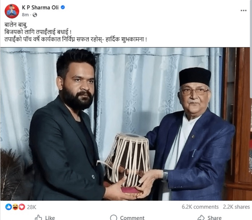 काठमाडौँ । नेकपा एमालेका अध्यक्ष केपी शर्मा ओलीले राष्ट्रिय स्वतन्त्र पार्टीका वरिष्ठ नेता बालेन्द्र शाहलाई बधाई दिएका छन् । झापा–५ बाट निर्वाचित भएका बालेनलाई ओलीले शनिबार बधाई र शुभकामना दिएका हुन् ।