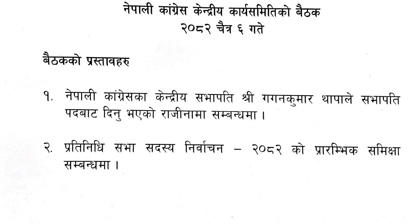 बैठकमा दुई वटा प्रस्ताव पेश भएका छन् । बैठकमा सभापति गगन थापाले दिएको राजीनामा र प्रतिनिधिसभा निर्वाचनको समीक्षा गरी दुई प्रस्ताव पेश भएका हुन् ।