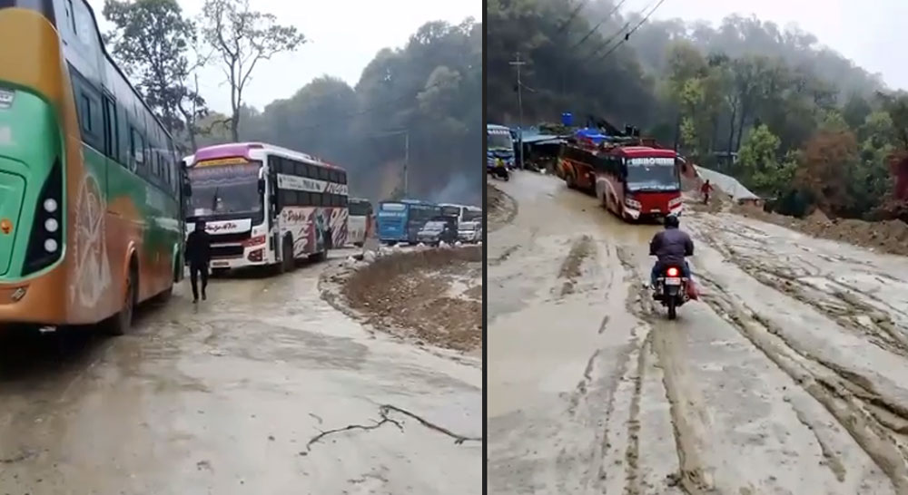 भारी वर्षाका कारण विनयी त्रिवेणी गाउँपालिका २ दाउन्ने बजारस्थित ६४ मोडमा सडक मर्मत भैरहेको स्थानमा सडक हिलो र चिप्लो हुँदा राजमार्ग अवरुद्ध भएको हो ।