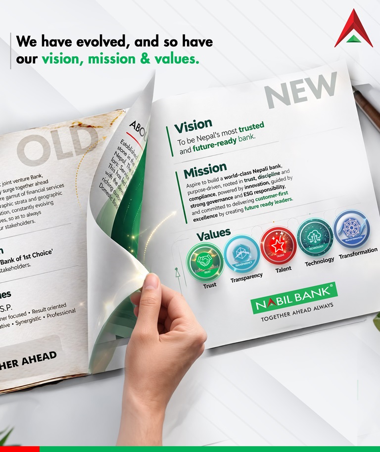 Nabil Bank introduced its new vison as ‘To become Nepal’s most trusted and future-ready bank’. Similarly, the new defined mission statement of the bank is: ‘Aspire to build a world class Nepali bank, purpose driven, rooted in trust, discipline, and compliance, powered by innovation, guided by strong governance and ESG responsibility, and committed to delivering customer-first excellence by creating future ready leaders.’
